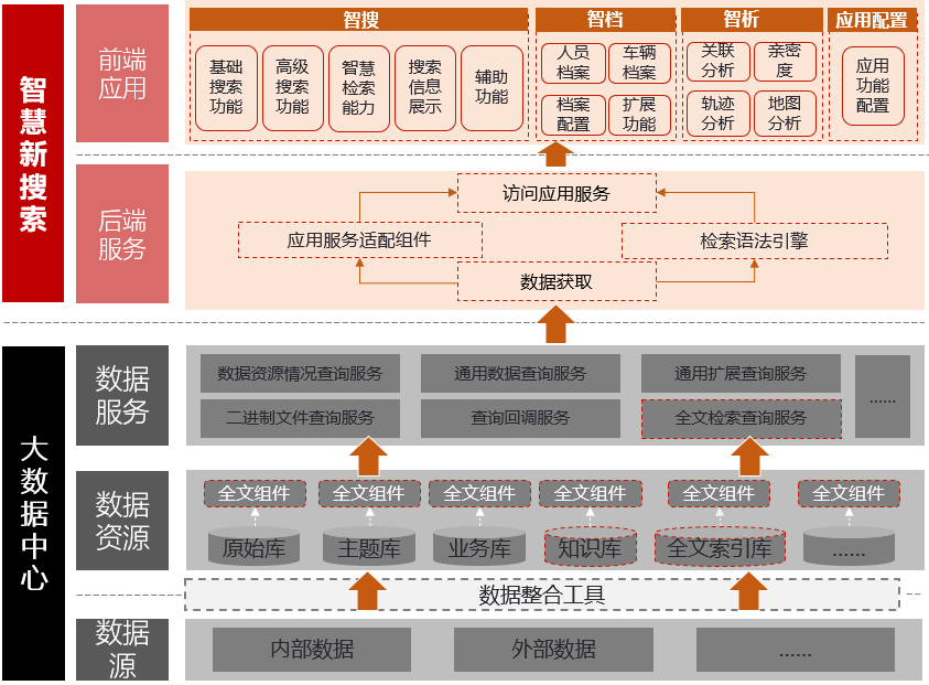 集成各类基础的搜索功能,支持为各类数据源给予统一的全文检索服务,支持与、或、非等运算方式,支持丰富的检索语法,以便给予全面的检索功能。